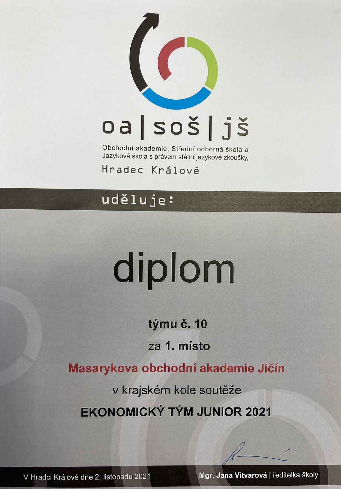 Naše škole obsadila 1. místo v krajském kole soutěže Ekonomický tým JUNIOR 2021.