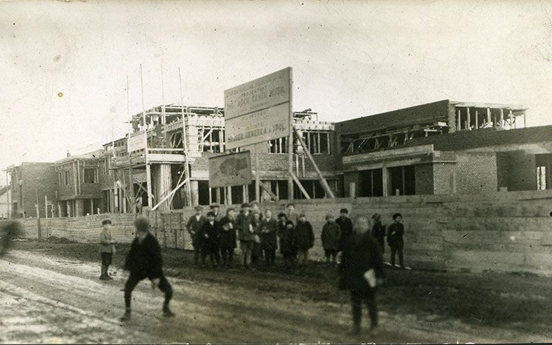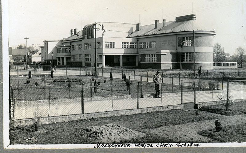 Dostavěna budova školy, název Masarykova veřejná obchodní škola města Jičína